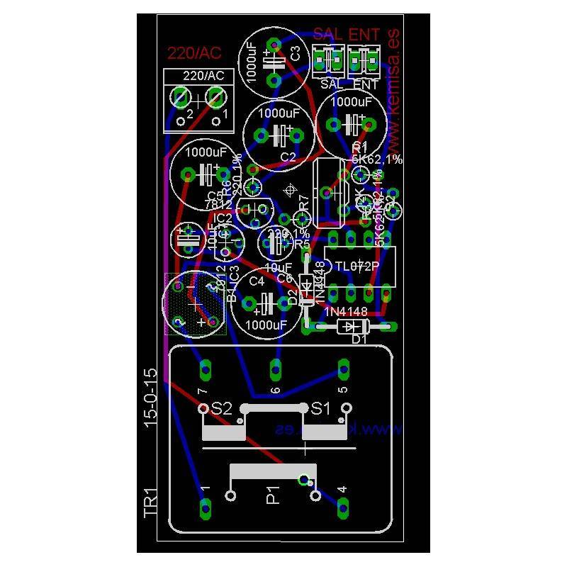 El circuito es bastante sencillo. Hemos integrado la fuente de alimentación para que sea más compacto el montaje. Dicha fuente de alimentación ha de ser simétrica y de +- 12 voltios para que el integrado TL072 funcione correctamente y la rectificación sea efectiva. La aplicación de éste circuito como rectificador de onda completa se adapta perfectamente a las necesidades de nuestra pinza amperimétrica para el hogar.